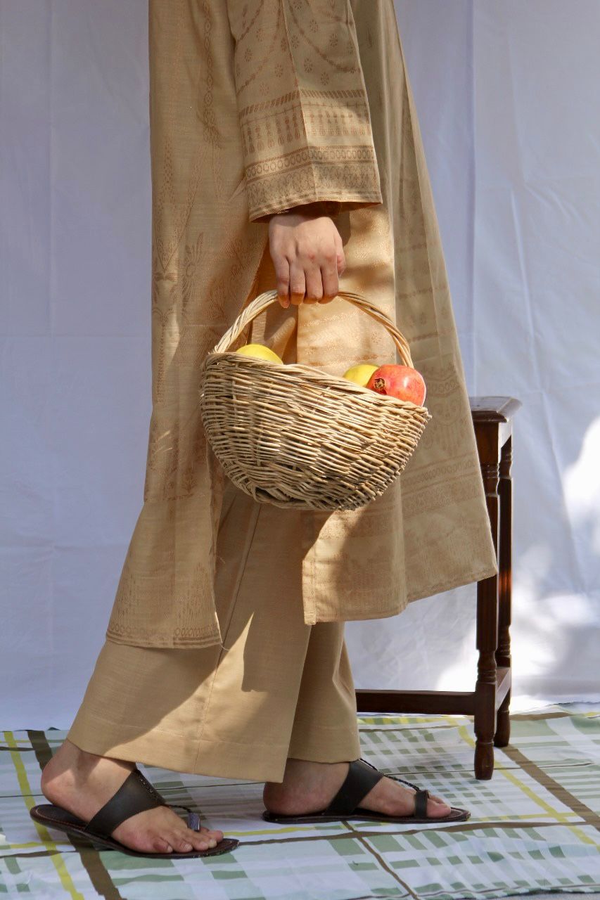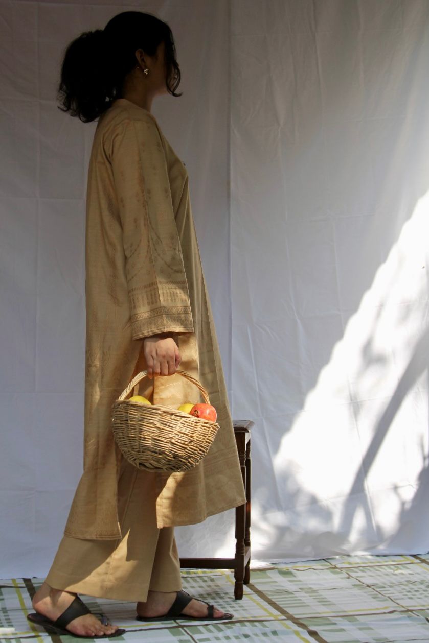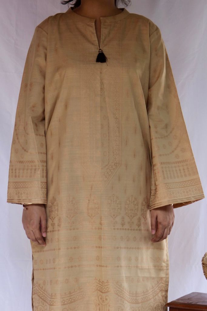 This 2-piece jacquard Khadder set features a long shirt paired with straight plazo pants, ideal for comfortable yet stylish winter wear. The shirt showcases elegant jacquard printing, enhanced by minimal tussles at the neck for a refined detail. Perfect for casual occasions, this ensemble combines warmth with sophistication, ensuring a chic and effortless look throughout the season.