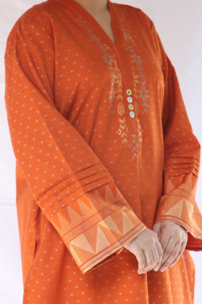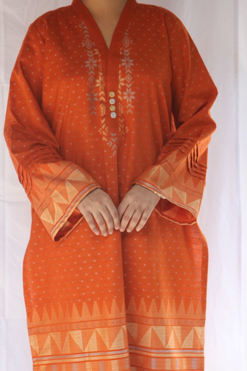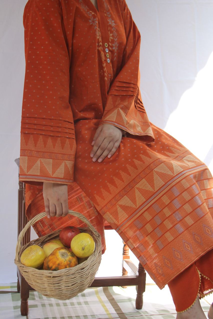 This 2-piece jacquard Khadder set features a long shirt paired with straight trouser, ideal for comfortable yet stylish winter wear. The shirt showcases elegant jacquard printing, enhanced by minimal tussles at the neck for a refined detail. Perfect for casual occasions, this ensemble combines warmth with sophistication, ensuring a chic and effortless look throughout the season.